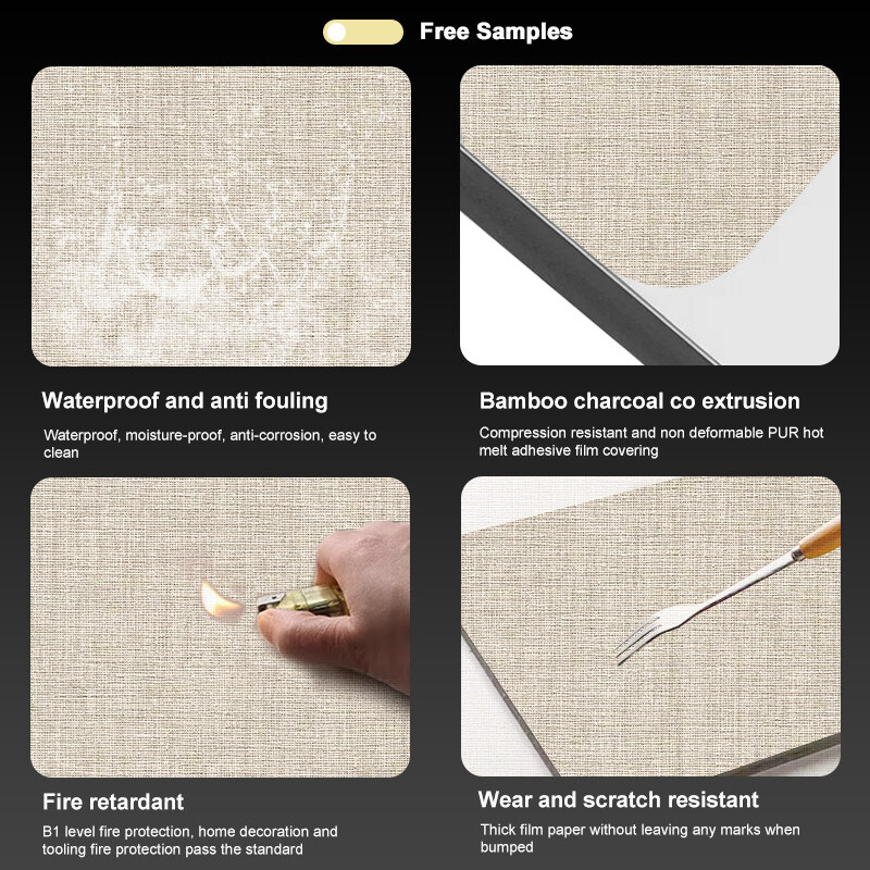簡単な設置、環境保護、柔軟性、曲げ可能、高密度、折りたたみ可能。耐火性+防水性+防湿性+耐スクラッチ性+吸音性、防カビ性。軽量。クリアな質感、多様な色など。